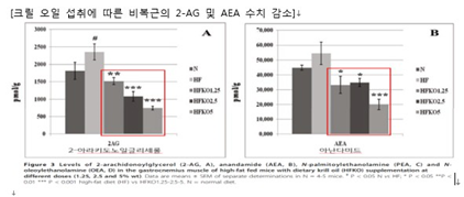 일반 고지방식이군과 크릴오일을 함께 섭취한 군을 비교한 결과, 비복근에서는 2-AG 및 AEA(비만유발물질) 수치가 60%나 넘게 줄었으며 서해부(사타구니)에서도 일반식이군과 비교하여 50% 이상 그 수치가 줄어들었습니다.