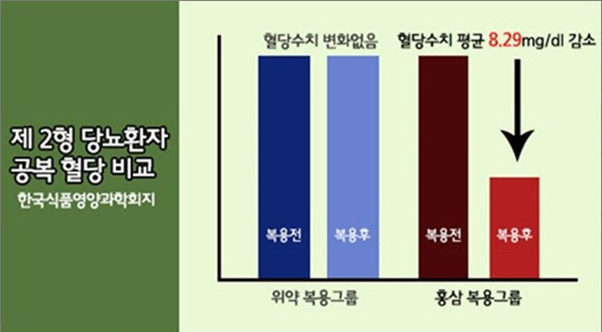 그 결과 위약을 복용한 그룹은 어떠한 변화도 보이지 않은 반면, 홍삼을 복용한 그룹은 혈당 수치가 8.29mg/dl이나 감소했는데, 이는 홍삼이 당뇨 식이요법만 진행하는 것보다 당뇨정상수치 유지에 좋은 음식임을 의미한다.